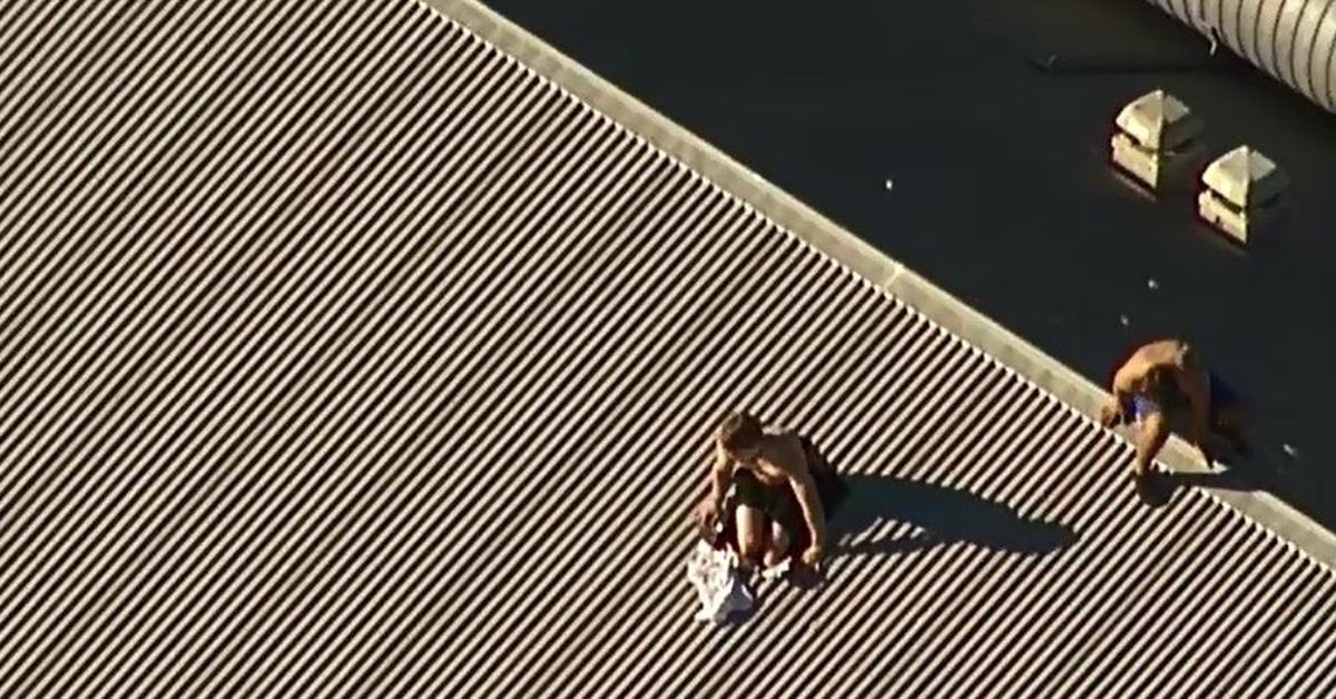Two shirtless boys are seen atop the roof. Images caught by news helicopter shows the shirtless teenagers running riot on top of a building and appearing to attempt to cause further damage about 3pm.