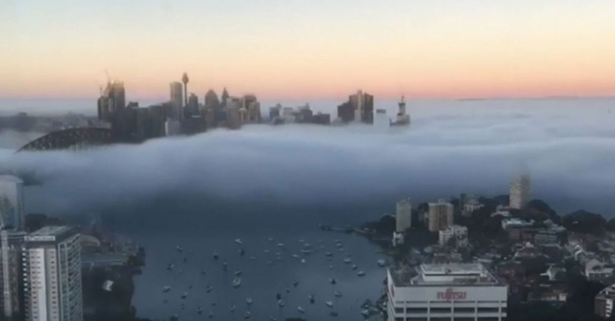The cloud has blanketed parts of the citys west and sydney harbour with the opera house and harbour bridge. Heavy fog in sydney has caused flight delays and saw all ferries services suspended.